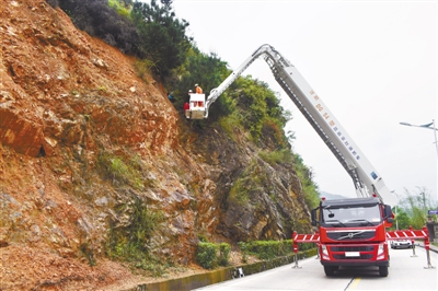 事件:一男子因摔倒受伤被困半山腰,漳平消防大队消防员赶到现场后,利用举高平台消防车成功将其救下。