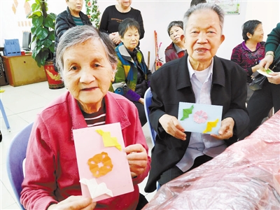 近日,新罗区南城街道莲东社区居委会联合相关单位组织社区志愿者、计生协会会员在莲东经济适用房小区C组团居家养老活动室联合举办四月“齐心共祝同欢笑、长者集体生日会”活动。老人们在服务站欢聚一堂,玩游戏、做手工、吃蛋糕、领礼品,度过了一个温馨热闹的生日。图为老人展示手工贺卡。