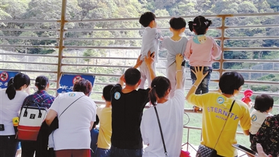 “五—”期间,梅花山虎园内游人如织,记者看到,尽管四处都有“有序参观 严禁攀爬”的警示牌,但不少孩子仍爬上了高高的栏杆,—旁的家长们不但没有阻止,反而帮助孩子攀爬栏杆,实在大煞风景。
