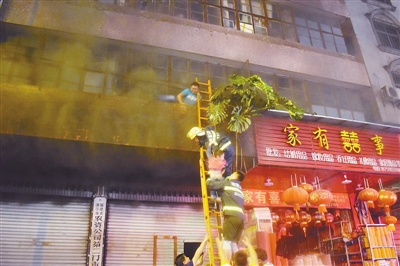 消防救援人员一组利用工具破拆1层着火店铺,正面射水控制火势;另一组,铺设水带到该建筑后方,用水枪控制火势蔓延。同时,成立疏散营救小组,进行现场搜救疏散。