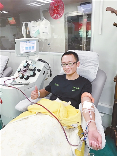 漳平市市场监督管理局干部杜毅,自2016年11月开始至今已献血35次,每次捐献2个治疗量血小板,约合全血1600ml,献血量累计达53680ml,相当于将正常人人体的血液完全更换了13次,荣获2016-2017年度全国无偿献血奉献金奖。图为日前献血时的场景。 通讯员 林玲玲 摄