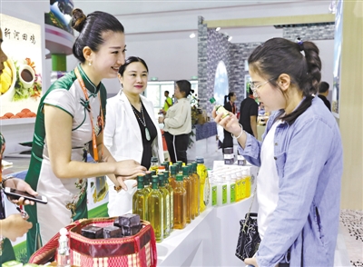 日前举办的龙岩市首届文旅康养博览会,汇集了200余家企业参展,通过4天的集中展示,为我市文旅康养企业搭建了宣传展示、交流推广、合作投资的平台,有力推动了我市文旅康养产业发展。图为在长汀县展台上,一家公司推出的天然有机山茶油系列产品深获消费者好评。 记者 郑秋生 摄
