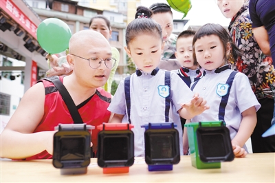 小朋友与家长在“六一”趣味活动中学习垃圾分类知识