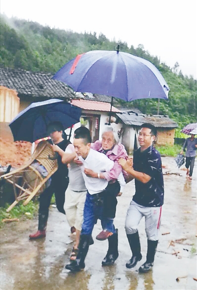 10日上午,在武平桃溪镇新田村,镇干部背着83岁的老人李五妹从危房转移,李五妹行动不便,家中只婆媳两人,将老人就近转移后,李五妹抹着泪感动地说:“感谢党和政府关心!”据悉,该镇组织干部深入村组摸查并转移危房户,提前部署好防汛工作。截至6月10日,桃溪镇共转移地灾点群众17户45人,无人员伤亡。通讯员 邱晓丽 王占宏 摄