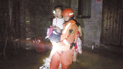 6月10日凌晨3时08分,长汀县汀州镇水门巷88号附近因连日暴雨导致内涝,10名群众被困。消防人员抵达现场后兵分两路,挨家挨户转移群众。截至4时20分,10名被困群众全部脱困。随后,消防人员帮助居民转移冰箱、洗衣机等财物,共计价值近10万元。图为消防员转移被困儿童。