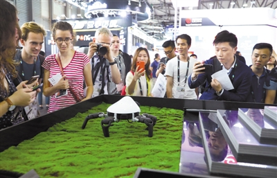 6月11日,一款可编程全地形六足机器人吸引参观者驻足观看。当日,第五届亚洲消费电子展在上海新国际博览中心开幕,包括5G、人工智能、增强现实/虚拟现实和汽车技术等相关领域的最新电子科技创新技术成果在展会期间集中呈现。 新华社 发