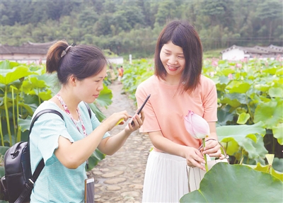 漳平市双洋镇东洋村利用百亩荷塘农业观光旅游品牌效应,策划“莲花出水竞脱贫”荷花种植项目,依托东洋生态种养专业合作社,统一流转土地30亩,鼓励15户贫困户参加,带动贫困人口51人共同打造百亩荷花观赏园,通过专业合作社售卖莲子每户每年获得5000元以上收益。图为昨日荷花盛开该村扶贫荷花观赏园引来大批游客赏荷。 记者 傅长盛 摄