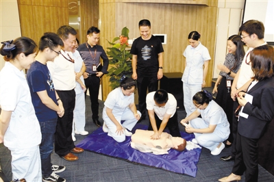 6月13日,龙岩市“从心启航”心肺复苏全民公益行动第59场·紫金矿业厦门站在中航紫金广场举行,40多人参加心肺复苏术培训。这是“从心启航”公益项目首次从闽西革命老区走进厦门经济特区,品牌影响力进一步提升。图为医护人员开展心肺复苏术操作技能培训。