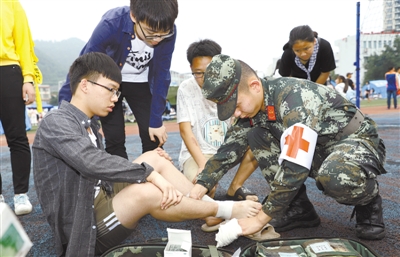 6月18日,在宜宾市珙县第一中学,武警四川省总队乐山支队卫生队给受伤的中学生包扎。6月17日22时55分,四川宜宾市长宁县发生6.0级地震。截至18日16时,四川长宁地震已有13人遇难,199人受伤。经消防指战员全力搜救,共救出被埋、被困群众20人,疏散群众731人。中央救灾物资成都储备库已向灾区调拨帐篷5000顶、折叠床10000张、棉被20000床,截至6月18日12时已发放帐篷450顶、折叠床900张、棉被3700床。