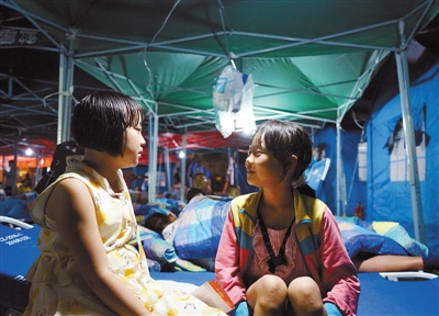 6月18日,四川省宜宾市长宁县双河镇双河中学安置点内,两个小朋友在帐篷内聊天。