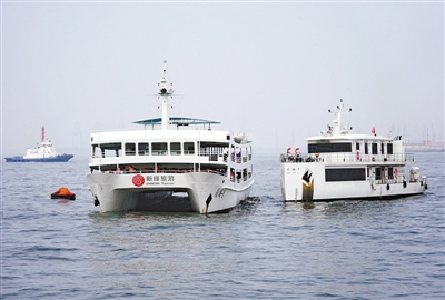 6月19日,救援船(右)在演习中向“事故船”靠帮。当日,河北省海上救助中心在秦皇岛市海港区东山浴场附近海域举行大型客船人命救助暨污染事故应急联合演习,以检验成员单位应急反应能力,提高海上应急处置实战水平。