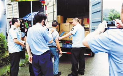 13日,连城县市场监管局朋口市场监管所根据厂家举报,对长汀的闽F-CH653号送货车进行检查,依法扣押涉嫌侵权的洋河“海之蓝”白酒93瓶,并现场抽样封存,案值金额约1.9万元,现案件在进一步调查中。图为执法检查场景。