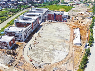 龙岩实验学校项目总投资2.68亿元,位于新罗区东肖镇,包含54个教学班(小学36个班、初中18个班),目前小学部、初中部各主楼均已完成外部装修及外架落架,将有效改善新罗区东肖镇、经开区两个片区义务教育阶段的教育配套资源薄弱环节,促进片区教育配套日趋完善。图为航拍图。