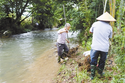 6月17日,长汀县馆前镇汀东河域,“民间河长”志愿服务者在打捞水面漂浮物。近期,持续强降雨致使该县馆前镇境内的汀东、坪埔、复兴等河域漂浮物剧增。雨过天晴后,该镇及时组织30余名工作人员以及“民间河长”开展“清河行动”,打捞水面漂浮物,呵护碧水。 通讯员 黎寿钦 摄