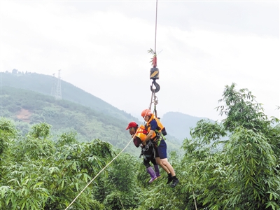 23日12时许,因受持续强降雨影响,新罗区苏坂镇苏坂河水位不断上涨,该镇一名妇女前往河对岸山上挖笋,返途时被困在河中间的小岛上,由于情况较为特殊,新罗消防大队临时调派一辆起吊机前往现场,成功将被困人员解救。图为救援现场。