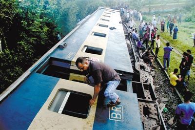 6月24日,在孟加拉国东北部地区,人们聚集在列车脱轨现场。孟加拉国警方24日说,一列从锡尔赫特市驶往首都达卡的客运列车23日晚在该国东北部地区脱轨,造成至少4人死亡、约100人受伤。