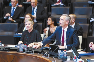 6月26日,在位于比利时布鲁塞尔的北约总部,北约秘书长斯托尔滕贝格(前右)主持北约国防部长会议。当日,北约国防部长会议在位于布鲁塞尔的北约总部举行。