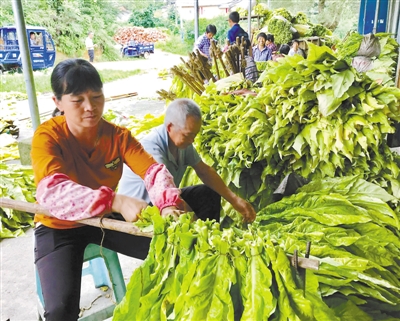 种植烤烟,是长汀县三洲镇丘坊村群众增收的主要来源之一。今年,该村种植烤烟450多亩,由于受雨水多和洪灾影响,今年烤烟的产量和质量都有所影响。图为近日丘坊村村民邱春叶雇村民抢收烤烟。邱春叶告诉我们,今年他家种植烤烟23亩,收了2500多公斤烟叶,预计收入9万多元,比去年少收500公斤,减少收入1万多元。 刘少雄 朱潞潞 摄