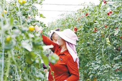 位于上杭县稔田镇丰郎村的田农农业公司是该镇引进的现代农业项目,拥有200亩智能温控大棚,主要种植辣椒、西红柿、花菜等作物,年销售额达500多万元,并吸纳30多名本地工人就业。图为近日,工人正在大棚里采摘西红柿。
