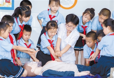 7月3日,呼和浩特市玉泉区通顺街小学学生在学习急救技能。当日,内蒙古呼和浩特市玉泉区通顺街小学开展“安全教育到身边 健康快乐过暑期”主题活动,通过实例警示教育、现场模拟急救等方式,提高学生的安全意识和自救自护能力。新华社发