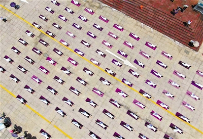 日前,在上杭县才溪镇广场上,100多名女性举行“百人瑜伽秀”,传播瑜伽运动文化,展示客家新女性风采(无人机航拍)。
