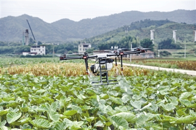 近段时间以来的连续暴雨,造成连城县一些乡镇不同程度受灾。北团镇文峰村村民罗家兴在下江村承包了150亩槟榔芋,眼看丰收在望,一场暴雨过后却全部被淹。灾情发生后,罗家兴不等不靠,在亲友的帮助下清洗满是淤泥的芋叶,又以12元/亩的价钱请来无人机对被洪水浸泡过的槟榔芋喷施叶枯唑等农药,努力将受灾损失降到最低程度。罗家兴告诉记者,过去人工打农药每人每天只能打一亩地,现在请无人机,150亩基本一天就可以搞定。图为7月1日无人机正在高效喷洒农药。