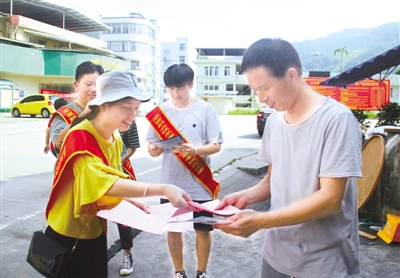近日,闽西职业技术学院城乡建筑学院与新罗区白沙镇联合开展主题为“青春心向党 建功新龙岩——走进美丽官洋,助力乡村振兴”的暑期“三下乡”大学生社会实践活动。40多名师生分别走访慰问了官洋村贫困户,帮助测量村道,举行中小学绘图比赛,开展问卷调查,参观古民居等。图为学生向群众宣传防范电信诈骗、禁毒等知识的情景。 记者 曾志明 通讯员 詹晓青 陈春福 摄