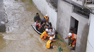 7月9日,在福建武夷山市新丰街道,救援人员用冲锋舟转移被困群众。