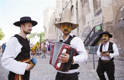 7月8日,在法国阿维尼翁,演员在街头向观众推介其主演的作品。第73届阿维尼翁戏剧节7月4日开幕。参演剧目的主创盛装走上大街小巷,向路人不遗余力推介作品,吸引他们前来观看,成为戏剧节期间一道独特的风景。