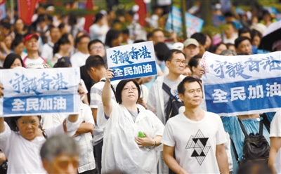 图为在香港添马公园,集会人员手举“守护香港”的标语。
