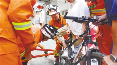 7月18日16时50分,永定女孩小王骑车至永定区九一中路纪念碑斜对面的巷子里时,一不小心,右脚被自行车卡住,区消防大队接到求助后消防队员及时赶到现场施救,并用消防车将其送至医院医治。 通讯员 周杨东 王艳艳 摄