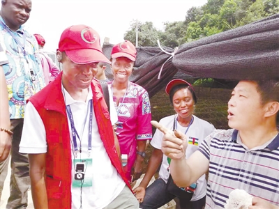 长汀县元口利民食用菌专业合作社纯天然生态种植竹荪、灵芝、三叶青、姜黄300多亩。2015年以来,由福建农林大学承办的“发展中国家菌草培训班”,每年都组织“一带一路”沿线发展中国家专家、学员,前来该种植基地参观考察、学习培训。图为7月20日合作社负责人吴正堂为中非菌草技术发展研修班的25名学员现场培训。