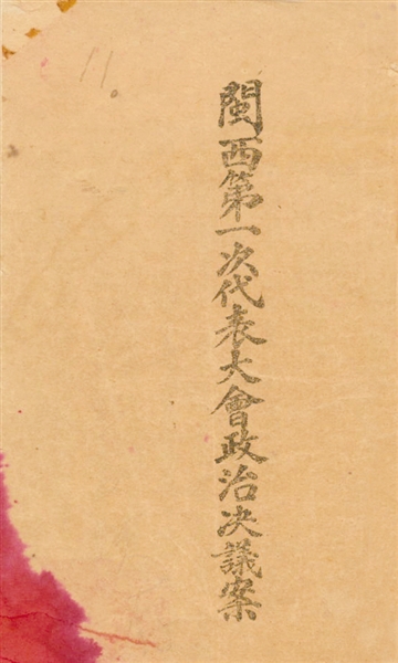 1973年2月16日晚,上杭县蛟洋公社蛟洋大队党支部在文昌阁召开党员大会。在党员陆续到会时,第六生产队的党员傅流基带来一本《闽西第一次代表大会政治决议案》,交给党支部。这份书体装订的文件长宽规格为16.8厘米×11.5厘米,封面和封底用黄色厚纸包装,封面中间偏右位置竖排印着一行楷体的“闽西第一次代表大会政治决议案”字样。正文内容也竖式排列,双面油印,共21页,12430字。字体端庄清晰,完整无缺。
