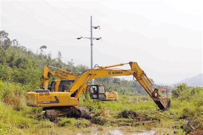 7月31日,新罗区红坊镇组织100余人对冷链物流项目涉及的龙溪邦村段灌溉渠改造工程进行保护性施工,有力推进冷链物流项目配套附属水利设施建设。图为施工场景。