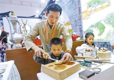 连城县将传承弘扬非遗文化与研学、旅游活动相结合,利用寒暑假、节假日,开展非遗进景区、进校园、进村居、进军营等系列活动,组织非遗传承人向参加研学活动的中小学生、各地游客宣传科普、学习体验连城非遗文化。图为近日,省级非遗连城四堡锡器制作技艺传承人马华强指导小学生练习锡器制作技艺。