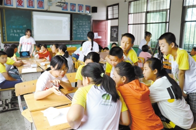 近日,上海华东师范大学社会实践小队部分成员来到长汀县馆前中心学校,以留守儿童为重点对象,开展为期一星期的“乡村振兴”支教活动,与儿童游戏联谊,传授知识,让他们感受温暖和快乐。图为大学生在指导儿童开发他们的智慧。 通讯员 黎寿钦 摄