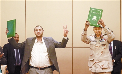 8月4日,在苏丹喀土穆,苏丹过渡军事委员会副主席穆罕默德·哈姆丹·达克卢(右)和“自由与变革联盟”主要领导成员艾哈迈德·拉比出席签字仪式。苏丹过渡军事委员会和主要反对派“自由与变革联盟”4日在首都喀土穆签署关于组建国家过渡时期治理机构的“宪法宣言”首份协议。此举将为苏丹组建过渡政府铺平道路。 新华社发(穆罕默德·海德尔摄)