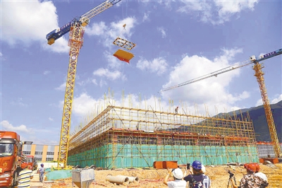 8月10日,福建建豪装配式建筑龙岩经开区中小微创业园PC装配式项目首吊顺利完成。据悉,该公司在高陂镇投资的龙岩市建筑工业化生产基地,总投资2.5亿元,是我市首个装配式建筑生产基地,设置6条生产线,具备年产18万立方米混凝土预制构件生产能力,目前已经全面投产。图为中小微创业园3号厂房装配式建筑吊装现场。 记者 傅长盛 摄