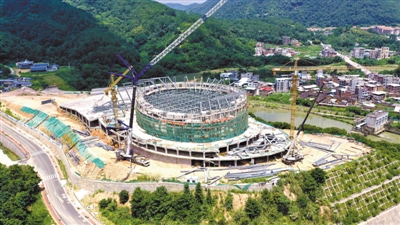 7日,记者在永定区客家博览园“福建土楼梦幻剧场”工地现场看到,工人们正在高温下加班加点作业。目前,员工宿舍、酒店式公寓工程主体已完工并验收完成;剧场工程已完成主体封顶。图为,航拍施工中的福建土楼梦幻剧场。