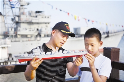 杨双峰拿着原163号南昌舰模型为儿子讲解(8月8日摄)。