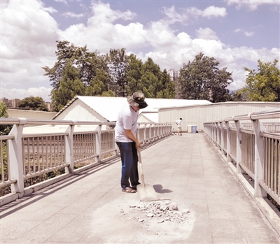 近期,施工单位对位于新罗区南城街道翠屏社区的翠屏路天桥破损地砖进行了修复,但未及时清理现场遗留的施工垃圾。8月9日,社区志愿者顶着烈日对桥面垃圾进行清理。