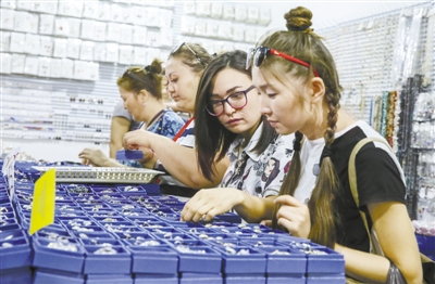 游客在中哈霍尔果斯国际边境合作中心的一处商场挑选饰品(8月11日摄)。
