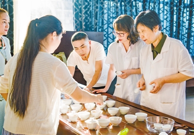 近日,由市供销社联合社主办的“市首期茶业流通领域技术深造班之——武夷岩茶专修班”在供销大厦举行。国家一级评茶师陈郁榕为学员授课,来自我市茶业流通领域的茶叶经营者65人参加了专修班学习。图为陈郁榕老师为学员讲解茶叶品鉴。
