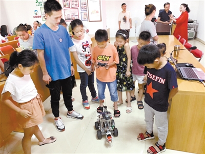 为了丰富青少年的暑期生活,培养青少年的科学素养,近日,新罗区中城街道虎岭社区致公党学校特邀福建信息职业技术学院李瑜芳教授为辖区青少年带来一堂别开生面的《机器人科普与产业新进展》知识讲座。图为孩子们在志愿者的指导下亲自体验小型移动机器人。记 者 罗姝