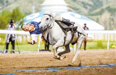 8月20日,骑手在“蒙古马”传统技巧表演中展示骑马拾哈达。