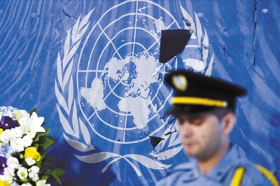 这是2019年8月19日在位于纽约的联合国总部拍摄的从2003年联合国驻巴格达办事处爆炸事件现场取回的联合国旗。当日,联合国举行仪式,缅怀2003年在联合国驻巴格达办事处爆炸事件中殉职的工作人员,以及其他为联合国事业殉职的人员。 新华社记者 李木子 摄