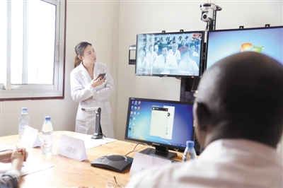 8月19日,在喀麦隆姆巴尔马约,中喀医生在捐赠仪式上通过远程会诊设备进行首次连线。中国山西大同第三人民医院在19日中国医师节当天向喀麦隆姆巴尔马约医院捐赠一套远程会诊设备,并帮助喀方现场完成首次连线。 新华社记者 乔本孝 摄
