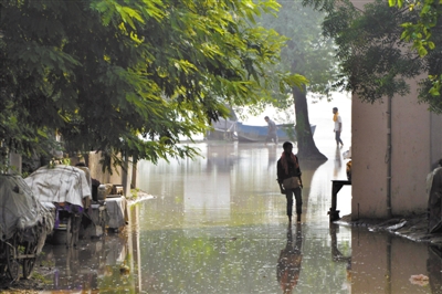 8月20日,在印度新德里低洼地区的一个棚户区,人们涉水前行。连日来,暴雨导致印度亚穆纳河水位上涨,新德里市政府要求生活在低洼地带的人们转移到安全地区。
