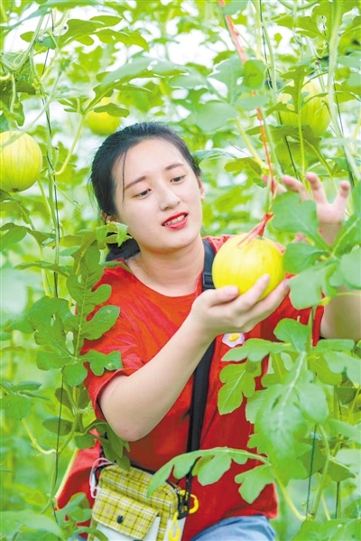 上杭县古田镇五龙村园区在全市率先引进太空果蔬种植农庄项目,利用航天工程育种筛选培育出的作物新品种具有安全、高产、高营养的优势和特色,种植黄瓜、蛋茄、小番茄、辣椒、甜瓜等特色果蔬共10余种29亩,今年开始挂果,农庄可开展各种采摘体验、科普教育、农耕实践等服务,形成了独特休闲农业文化氛围,受到市民追捧。图为日前市民在采摘太空甜瓜。 记者 傅长盛 摄