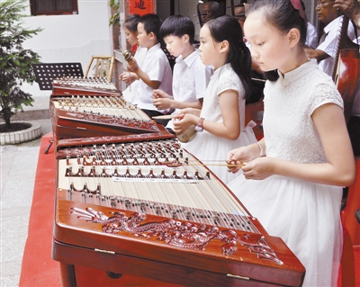 作为传统文化的十番音乐,传承问题近年日益迫切。永定中小学生利用暑假富余时间,主动拜师学艺,学习二胡、笛子、铙钹、古筝等民族乐器,以使传统文化代代相传。图为近日,培丰镇一群学生学习十番音乐的场面。 通讯员 郑素梅 王龙林 摄